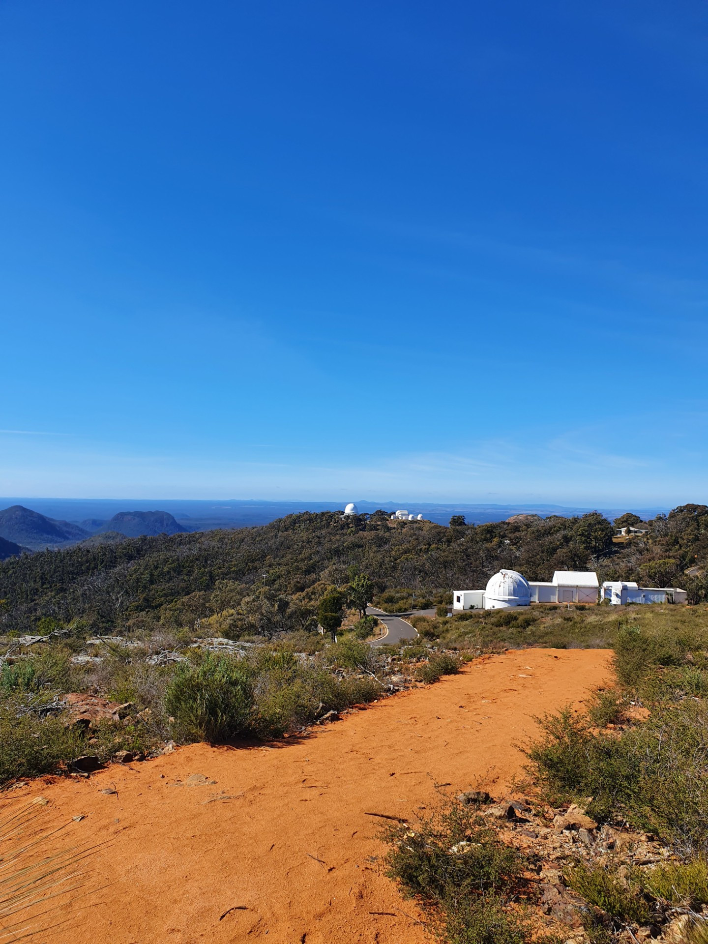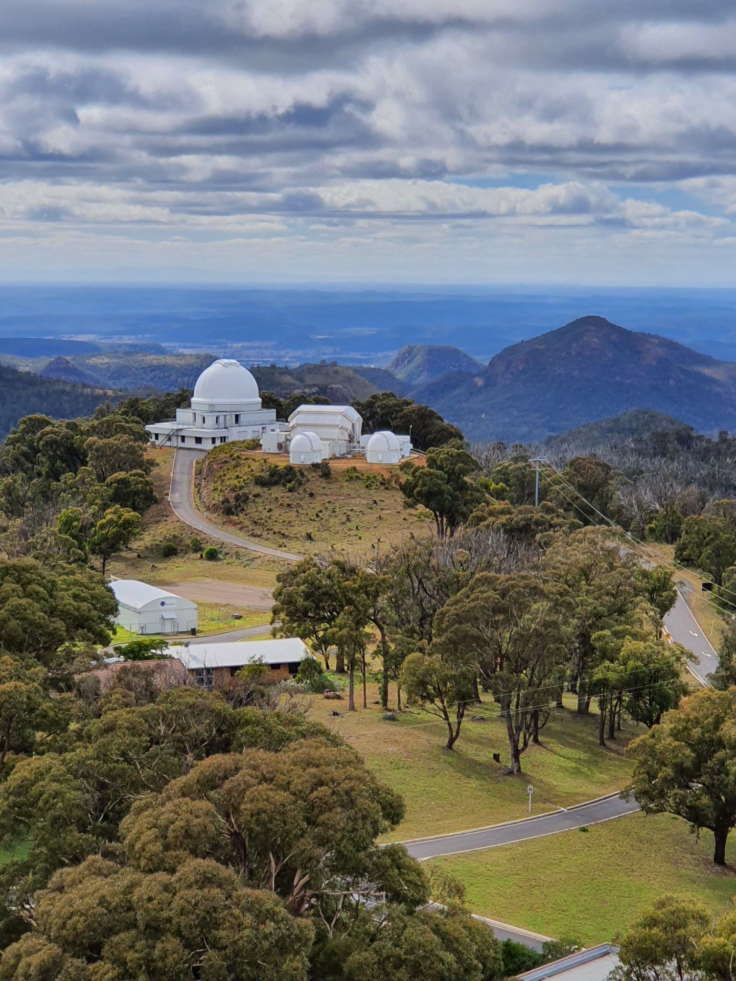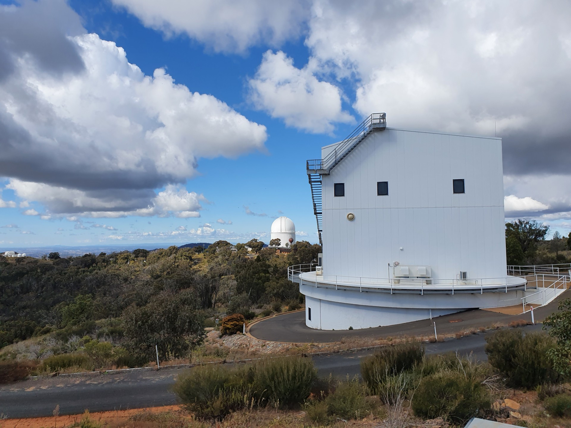 This view is from the walkway on the outside of the AAT dome. The large dome houses the UK Schmidt 1.2m telescope. To the right we see the two 1m domes and the 2m Faulkes Telescope South in the building between the domes. These telescopes are part of the Las Cumbres Observatory global telescope network.